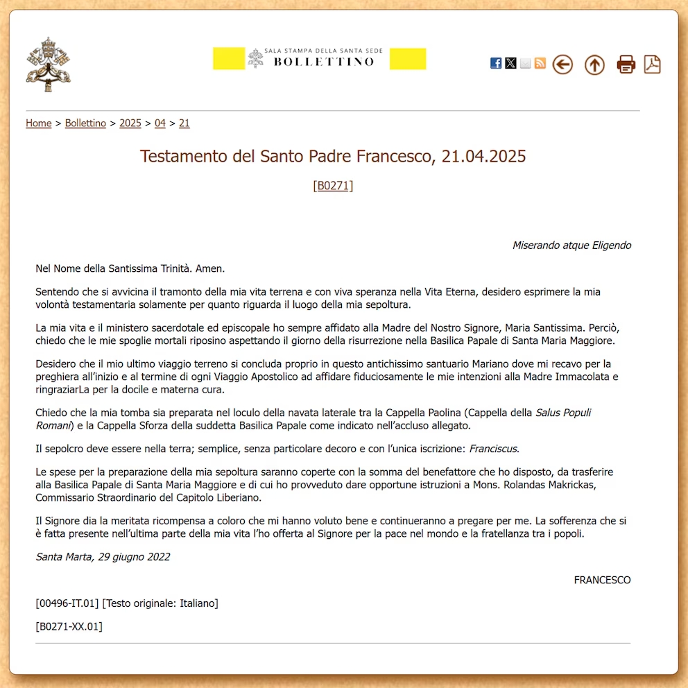 “Solicito que mi sepulcro sea preparado en el nicho de la nave lateral entre la Capilla Paulina (Capilla de la Salus Populi Romani) y la Capilla Sforza de la citada Basílica Papal como se indica en el documento adjunto. El sepulcro debe estar en la tierra; sencillo, sin decoración particular y con la única inscripción: Franciscus”, se lee en le testamento publicado hoy tras su muerte a los 88 años.