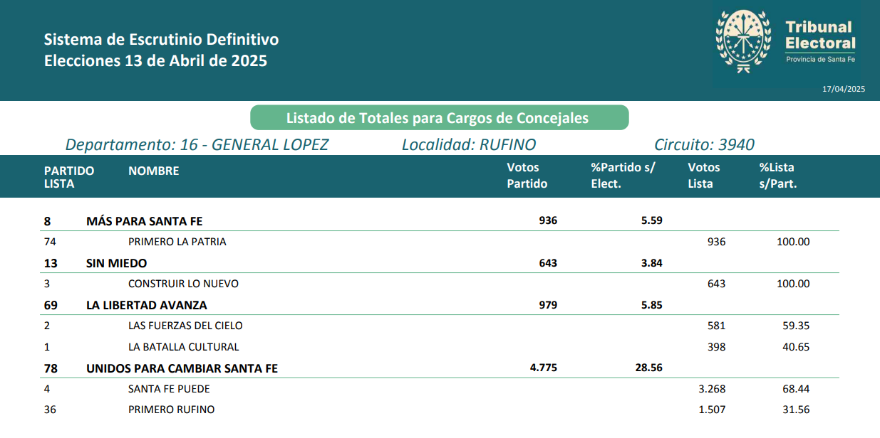 El Tribunal Electoral de Santa Fe difundió los datos del escrutinio definitivo para Convencionales Constituyentes, Convencionales Departamentales y Concejales. Como así también, la conformación de las listas para aquellos que participaron de una interna; como lo es Unidos para Cambiar Santa Fe y la Libertad Avanza.