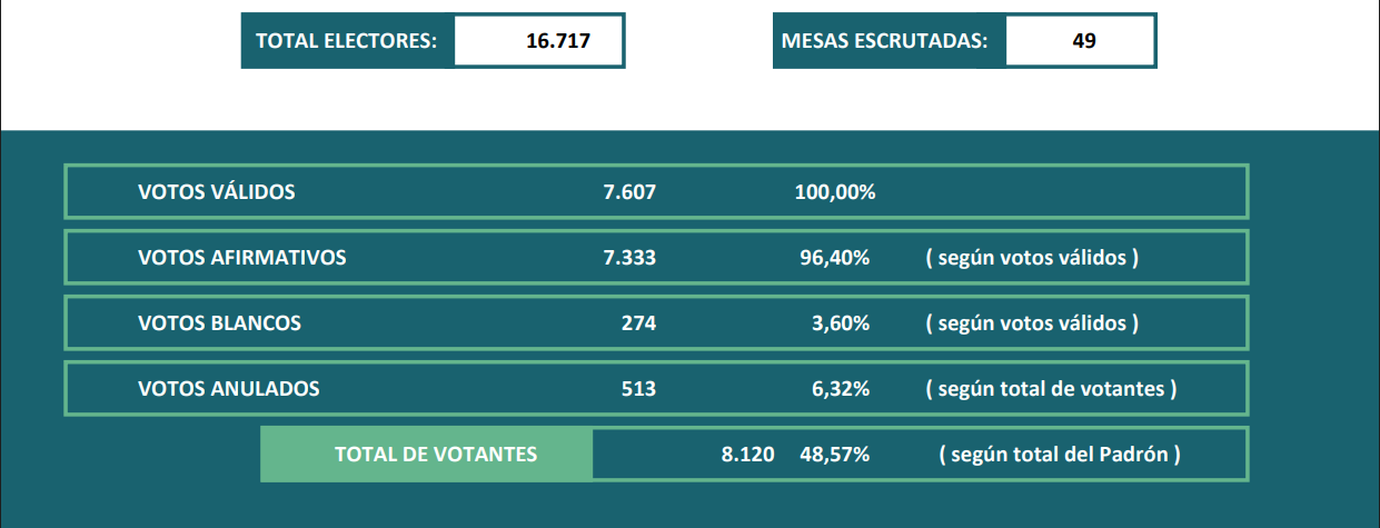 Algo para destaca es que ninguna de las listas sumó votos desde el escrutinio provisorio al definitivo. De los 7333 votos afirmativos, hubo 274 (3,60%) votos en blanco y 513 (6,32) votos nulos.