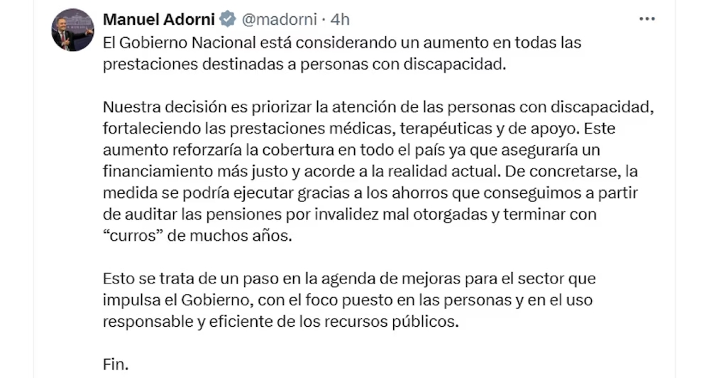 Sin embargo, pocas horas antes del inicio de la sesión el vocero presidencial Manuel Adorni anunció a través de las redes sociales que el Gobierno “está considerando un aumento en todas las prestaciones destinadas a personas con discapacidad”.