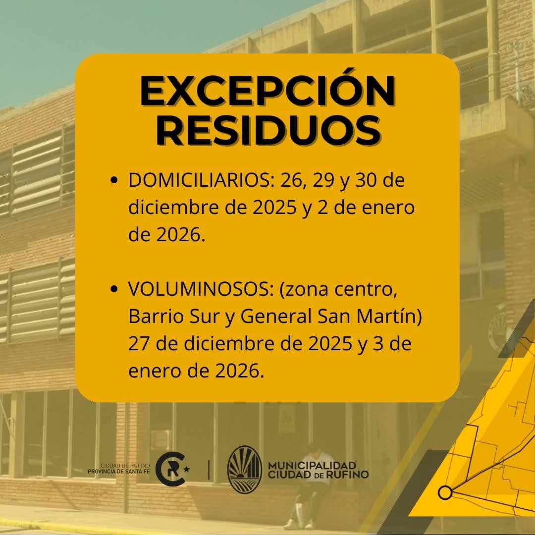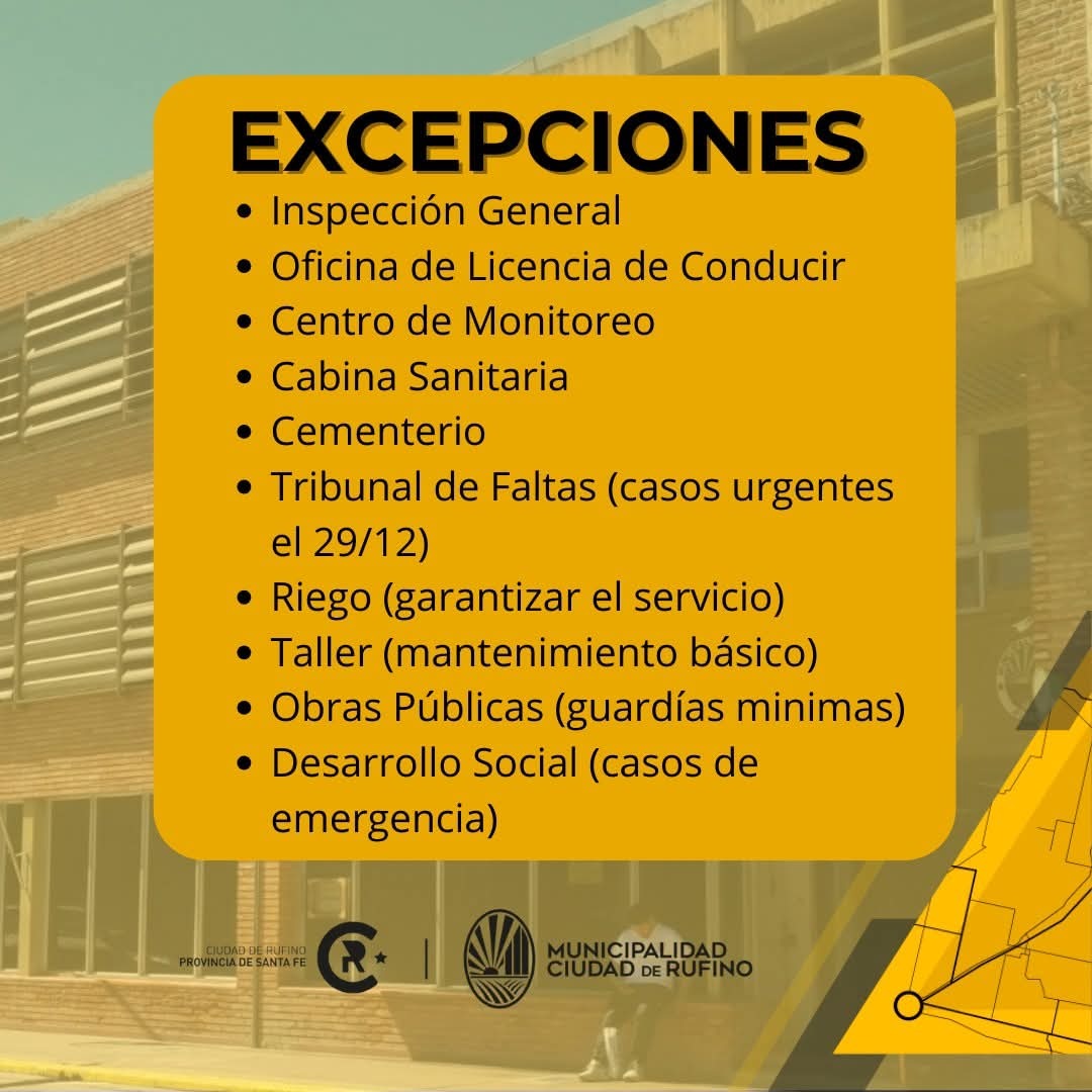 La Municipalidad de Rufino informa que, a través del Decreto Nº 176/2025 se dispone el cierre de las dependencias municipales durante el periodo comprendido entre el 24 de diciembre de 2025 y el 2 de enero de 2026, excepto aquellas áreas que deban garantizar servicios esenciales.