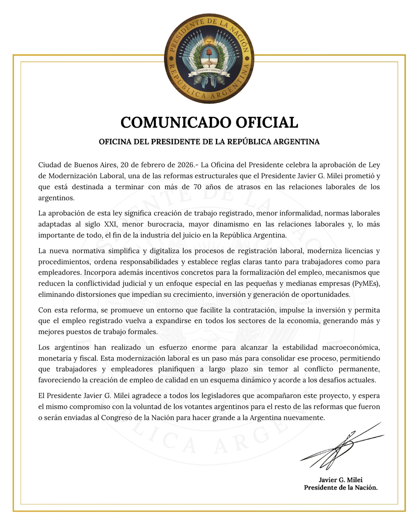 El comunicado oficial indica que la nueva normativa sentará bases para fortalecer la economía argentina, incentivando nuevas inversiones y brindando seguridad tanto a empresarios como a trabajadores.