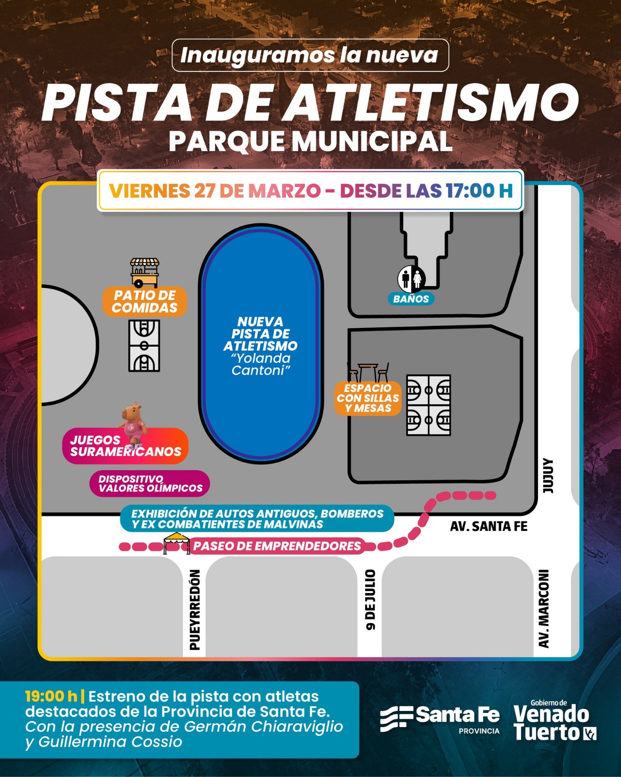Este viernes 27 de marzo, el Parque Municipal de Venado Tuerto será escenario de una jornada histórica para el deporte local con la inauguración oficial de la pista de atletismo que lleva el nombre de “Yolanda Cantoni” y el campo denominado “Danilo Werhli”, una obra impulsada de manera conjunta por el Gobierno de la Provincia de Santa Fe y el Gobierno municipal.